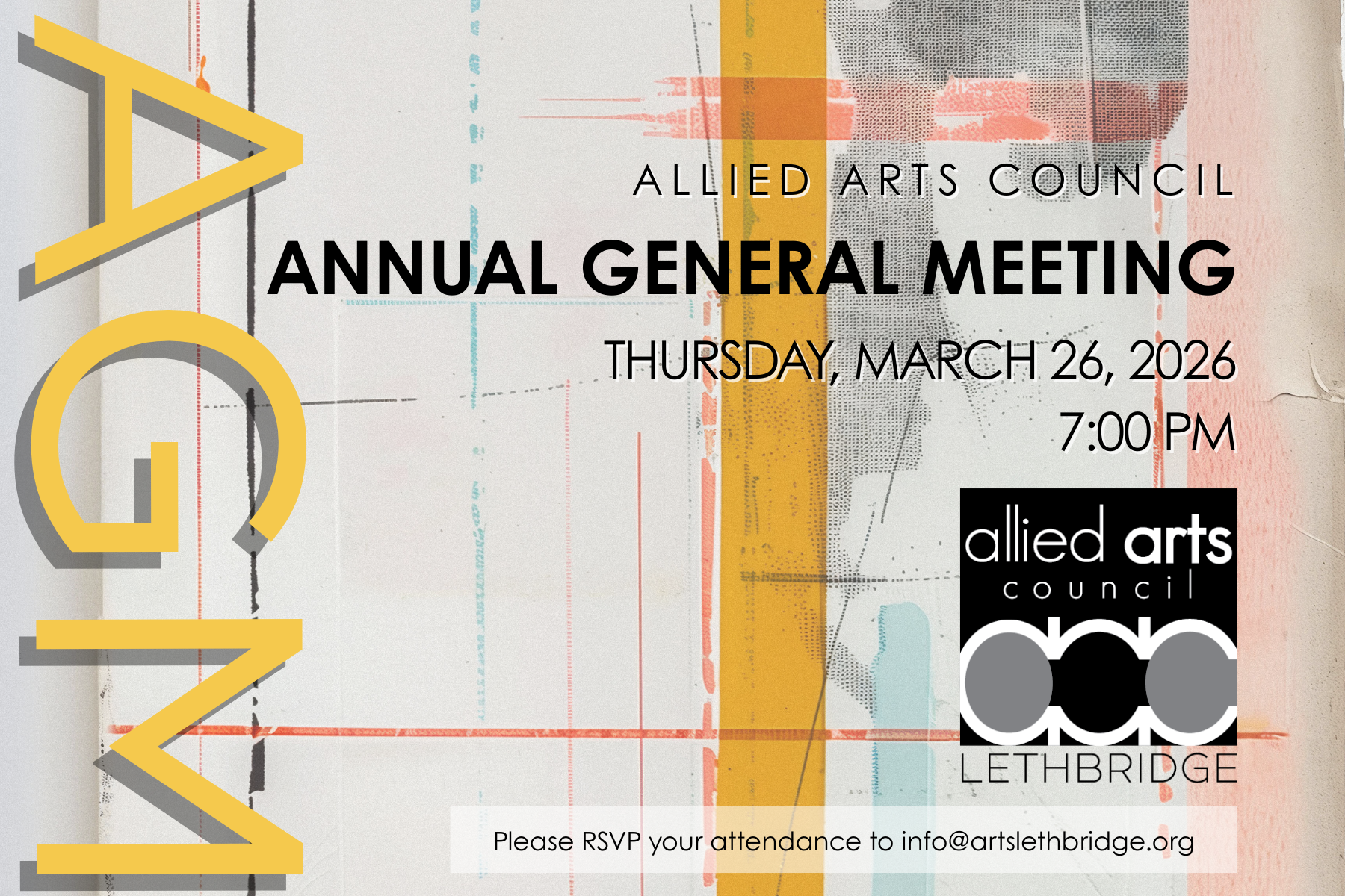 Save the date! The Allied Arts Council of Lethbridge’s Annual General Meeting is on March 26, 2026, at 7:00 PM with keynote speaker Charleen Davidson, of Community Foundation of Lethbridge and Southwestern Alberta.